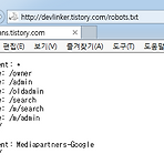 로봇 배제 표준[Robots exclusion standard] Rotobs.txt는 도메인을 가지고 있는 웹 사이트의 콘텐츠(contents)를 로봇이 접근하여 크롤링하는 것을 방지하기 위한 규약을 기술해 놓은 파일이다. 1994년 6월에 만들어 졌지만 이 규약은 권고안이기 때문에 접근 방지 설정을 하더라도 강제성이 없으며 실제 접근이 가능하다. 파일의 위치는 도메인의 root폴더에 위치한다. 예를들어, 나의 티스토리 도메인은 http://devlinker.tistory.com 이며, 브라우저에서 http://devlinker.tistory.com/robots.txt 입력하면 확인가능하다. 예제> 1. 사이트내에 모든 문서를 모든 로봇에게 접근 허용 User-agent: *